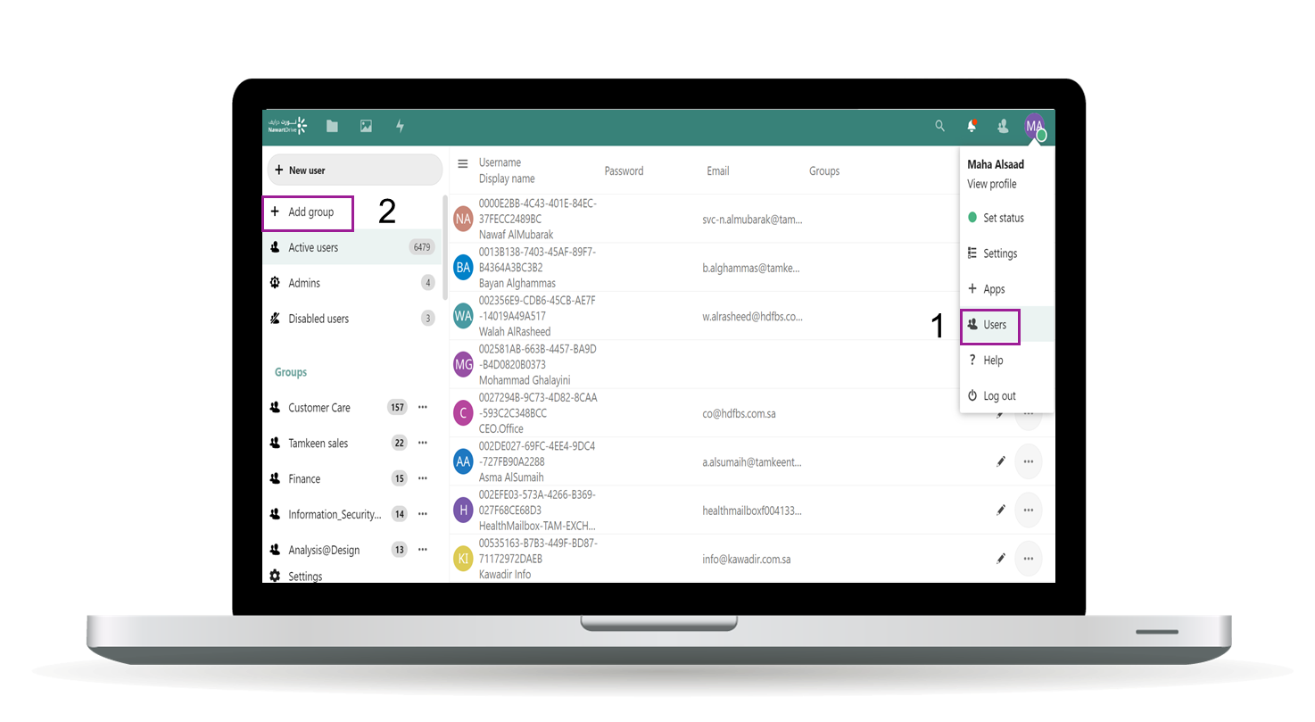 1. Choose users from the list. 2. Add new user. 3. Enter user information (username, email, password...etc.).